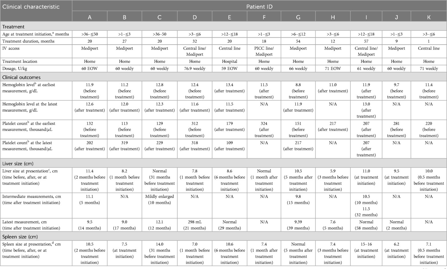 The initiation of ERT was determined based on clinical symptoms and elevated Gaucher disease-specific biomarkers. Velaglucerase alfa was started at the following ages: ≤3 months in four patients, >3–≤6 months in two patients, >6–≤12 months in one patient, >12–≤18 months in two patients, and >36–≤48 months in two patients. Patients received treatment for up to 57 months, with nine patients treated for 12 months or longer. Of eight patients who remained in the study, seven were treated with velaglucerase alfa for 20 months or more. The initial prescribed dosage of velaglucerase alfa was 60 U/kg EOW as per the clinical management plan; however, patients received doses of 59–77 U/kg according to clinic practice and individual clinical needs. The frequency of velaglucerase alfa administration was EOW in three patients and weekly in eight patients. One patient started receiving weekly infusions then continued with an EOW schedule (Table 2). Velaglucerase alfa was administered using central venous access, usually starting with a central line and switching to a mediport; all patients received home infusions except for one (treated at an infusion center because of parental preference). The youngest age for port placement was 2 months.