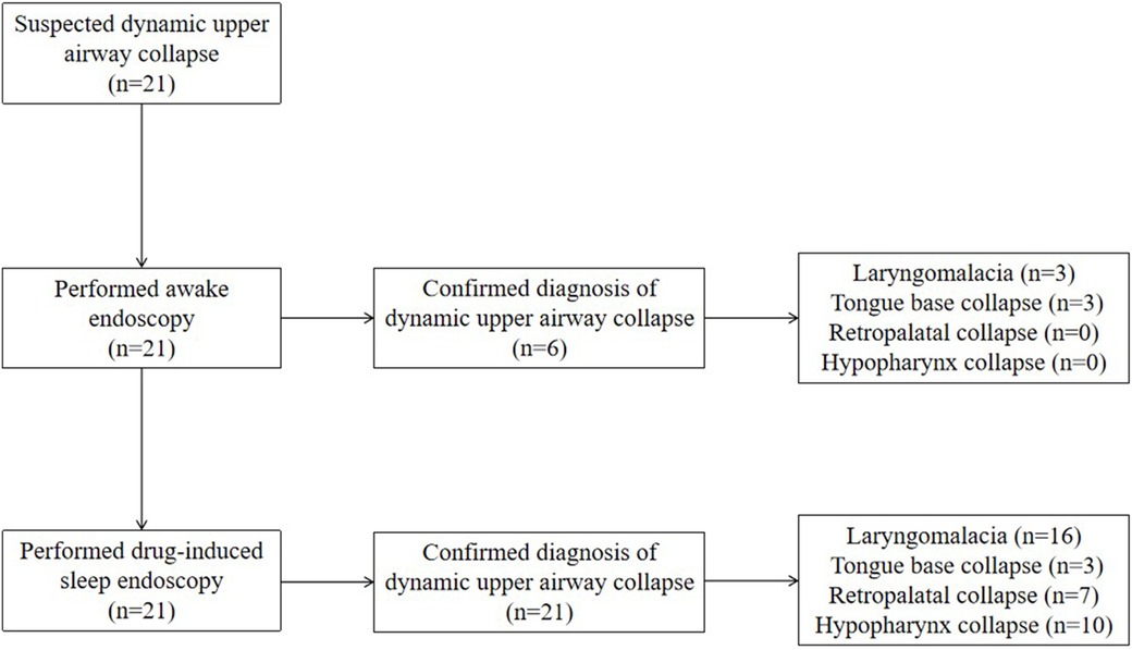 A total of 21 cases (male n = 17, female n = 4) were included. All 21 cases were initially suspected of having dynamic upper airway collapse based on clinical manifestations and were definitively diagnosed by endoscopy. The study flow diagram is shown in Figure 1. The cohort included 3 neonates and 18 cases beyond neonatal age. Six cases were born preterm, and 15 cases were born full term. At the time of bronchoscopy, the median age was 4.0 (2.0–9.0) months, and the median weight was 5.5 (4.2–7.4) kg. In terms of clinical manifestations, noisy breathing was observed in 12 cases, suprasternal retraction in 8 cases, and snoring in 7 cases (Table 1).