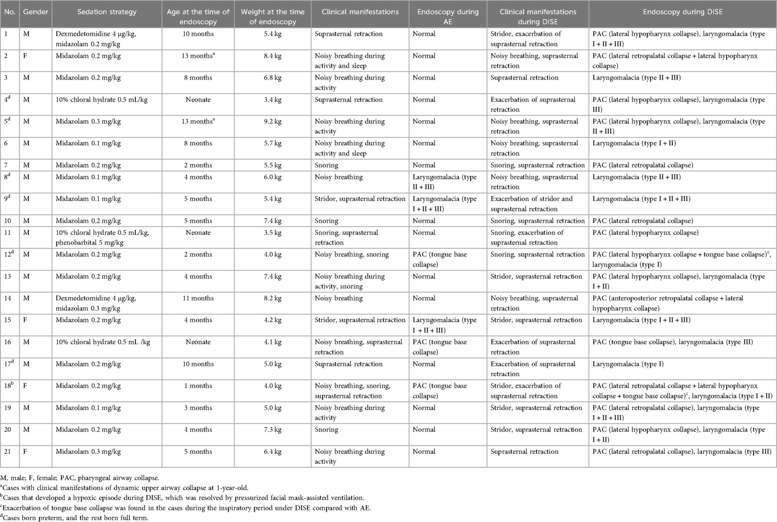 Methods: Infants with suspected dynamic upper airway collapse were enrolled in the study. All subjects developed clinical symptoms within the first year of life. Each subject underwent both awake endoscopy (AE) and DISE. Endoscopic findings and sedation strategies for DISE were recorded. The diagnostic rate of dynamic upper airway collapse was compared between the DISE and AE. Adverse events during DISE were also recorded.