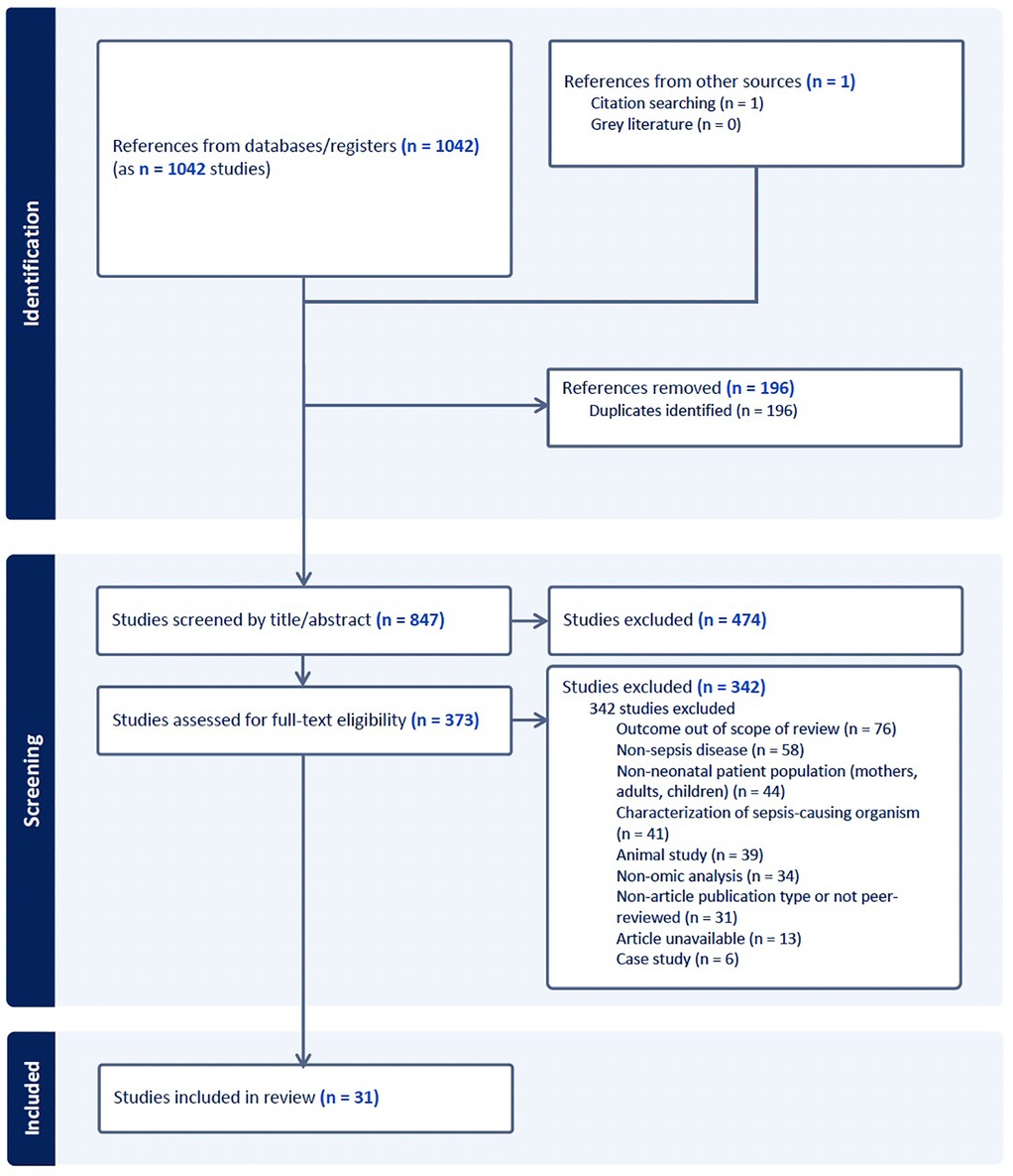 A systematic search of PubMed, EMBASE, and SCOPUS was conducted for articles published between January 2018 and June 2024 using the MeSH terms “neonatal sepsis”, “newborn”, “genomic*”, “proteomic*”, “transcriptomic*”, “microbiome”, “metabolomic*”, and “epigenomic*”. Equivalent controlled vocabulary terms were used for EMBASE and SCOPUS. Studies were included if they involved neonates aged 0–90 days with clinical suspicion or diagnosis of EOS or LOS, were published in English, and employed at least one molecular analysis technique as a primary methodology. Exclusion criteria included animal studies, non-original research, and dissertations. A total of 847 unique articles were identified, of which 31 met inclusion criteria for final review (Figure 1).