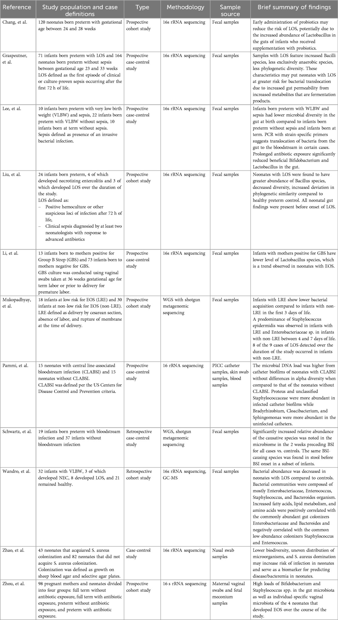 Eleven studies investigating the role of the microbiome in neonatal sepsis were identified, primarily targeting gut and nasal microbiota to explore the influence of microbial colonization patterns and antibiotic exposure on sepsis development (Table 1). All but one study collected microbiome samples both before and after sepsis onset, enabling analysis of dysbiosis preceding infection. The exception, conducted by Pammi et al. (28), analyzed microbial profiles on removed central line catheters and skin swabs from neonates with and without central line-associated bloodstream infections (CLABSI).