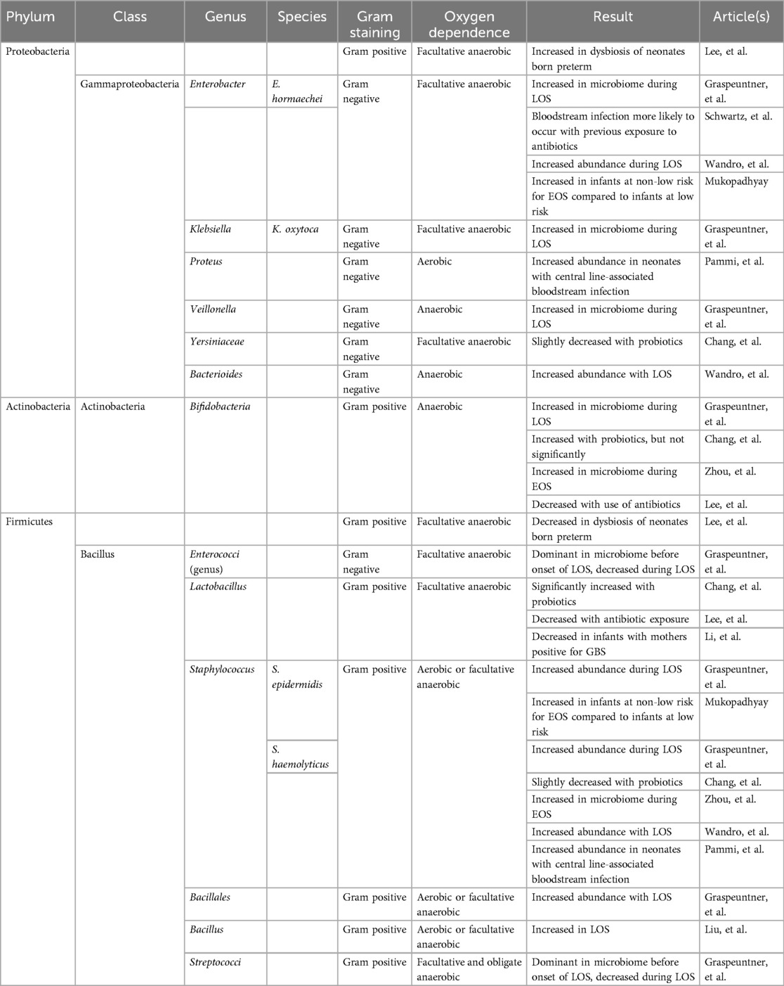 A common finding across multiple studies was a reduction in alpha diversity in neonates with sepsis (Table 1), although the specific bacteria noted to be present or absent varied by study. Lee et al. (29) reported significantly lower Shannon index values in infants born preterm with very low birth weight (VLBW) and sepsis compared to infants born preterm and term with VLBW but without sepsis from birth through 4–7 weeks of age. In contrast to infants born at term, whose microbiomes showed increased Firmicutes and Actinobacteria, healthy infants born preterm exhibited greater levels of Proteobacteria (29) (Table 2). Liu et al. (30) observed reduced alpha diversity during EOS or LOS, while Graspeuntner et al. (31) identified a predominance of Bacilli class species, including S. epidermidis and S. haemolyticus, in neonates with sepsis (Table 2). Similarly, Zhao et al. (32) found decreased diversity with a Staphylococcus aureus dominance in the nasal microbiome of infants with LOS in the week preceding bacteremia (Table 2). Wandro et al. (33) also reported a dominance of Staphylococcus in fecal samples from neonates who developed LOS (Table 2).