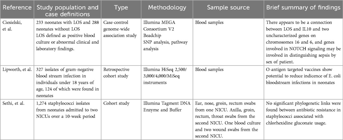 Three genomic studies published between 2018 and 2024 were included in the final review, each applying whole genome sequencing technologies with distinct objectives (Table 3). Two studies, conducted by Lipworth et al. (39) and Sethi et al. (40), focused on genomic characterization of bacterial isolates responsible for neonatal sepsis, while Ciesielski et al. (41) applied host genome sequencing to identify genetic variants associated with LOS in neonates.
