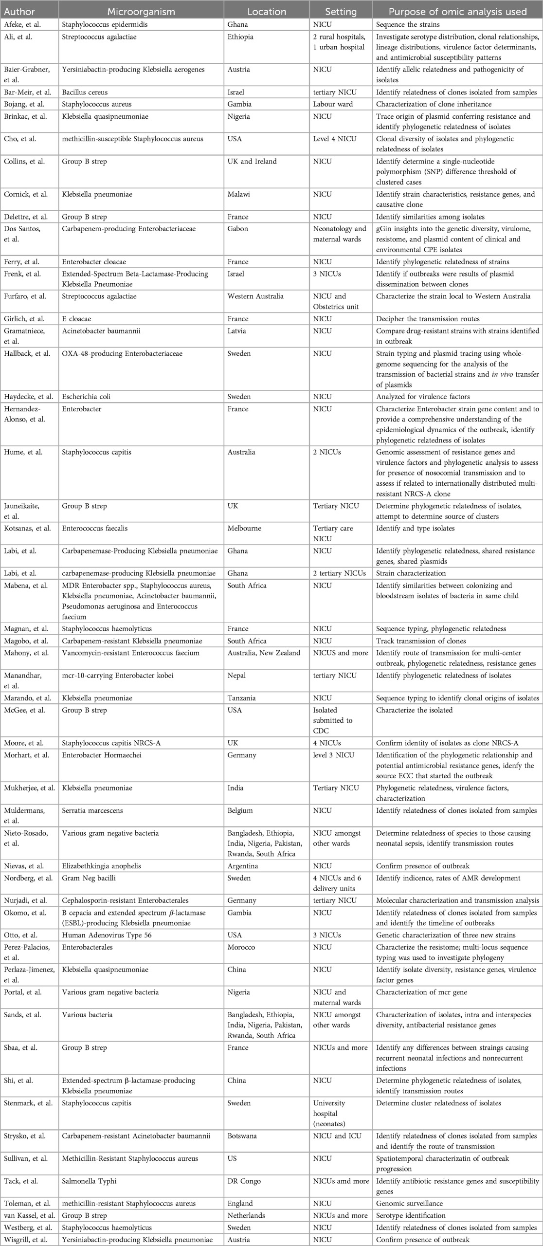 During the broader screening process, an additional 55 studies were identified that utilized genomic sequencing for epidemiological investigation of NICU outbreaks. These studies primarily focused on identifying transmission patterns and outbreak sources, and while highly valuable for infection control, they were excluded from the final review due to limited applicability to biomarker discovery. A summary of these studies is provided in Table 4 for reference.