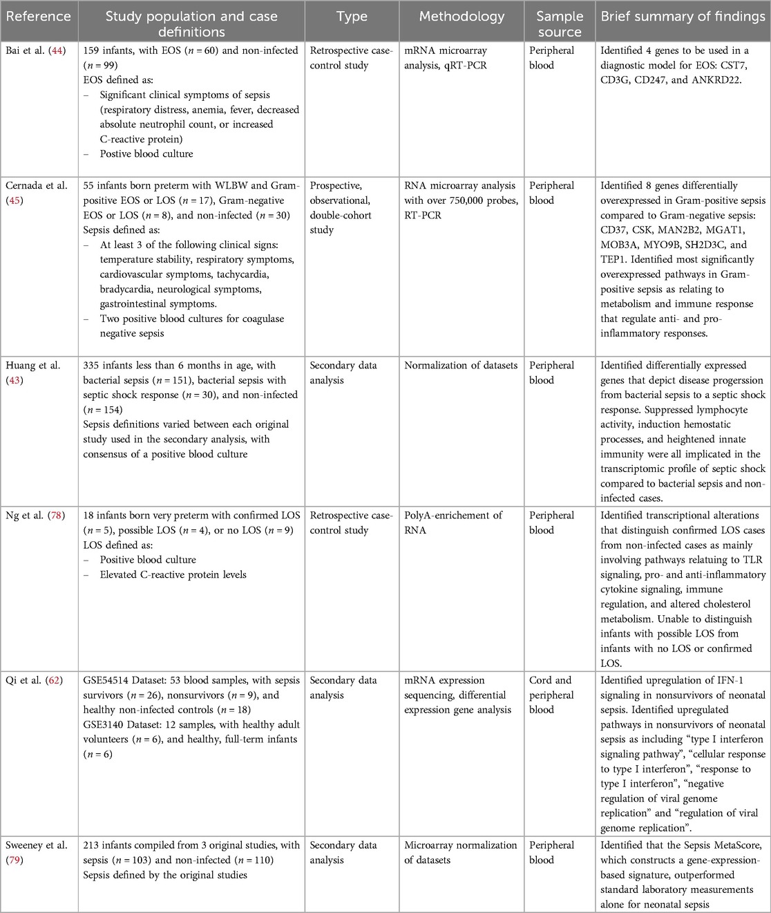 Six studies published between 2018 and 2024 utilized transcriptomic technologies as the primary method for investigating neonatal sepsis and were included in this review (Table 5). The studies demonstrated considerable heterogeneity in focus and design, including comparisons of neonates with EOS vs. LOS vs. neonates without sepsis (42), gram-positive vs. gram-negative infections (23), and varying clinical outcomes such as bacteremia vs. septic shock (43). No two studies directly evaluated the same neonatal subgroups, limiting direct comparisons across investigations.