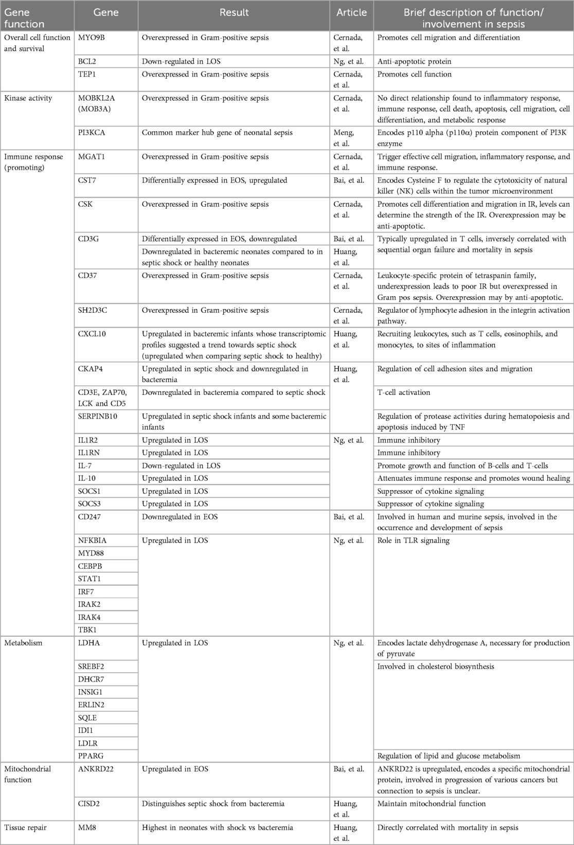 Despite limited overlap in specific genes across studies, multiple investigations reported genes involved in similar immunologic pathways, reinforcing shared biological mechanisms of neonatal sepsis. For example, CXCL10, a chemokine that recruits T cells, natural killer cells, and monocytes, was found upregulated in neonates with bacteremia but not in those with septic shock (43). This suggests that more robust leukocyte recruitment may be protective, consistent with the improved outcomes observed in infants with bacteremia compared to those experiencing systemic decompensation. Similarly, CSK, identified by Cernada et al. (45) as upregulated in gram-positive sepsis, promotes immune cell migration and may exert anti-apoptotic effects. Together, these findings suggest a common immunoprotective role for leukocyte migration, particularly in less severe forms of sepsis or gram-positive infections. This aligns with clinical observations of better prognosis in bacteremia and gram-positive infections (60, 61) and suggests that modulation of immune cell trafficking could be an avenue for future therapeutic intervention.
