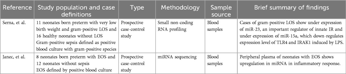 Two studies employing miRNA sequencing were selected for review, both of which used a prospective case-control design (Table 7). Serna et al. (46) investigated infants with VLBW and LOS, while Janec et al. (47) focused on neonates born preterm with EOS. Both studies identified differentially expressed miRNAs in neonates with sepsis that are known regulators of innate immune responses. Janec et al. (47) reported increased expression of miR-142-5p, miR-223-3p, and miR-148b-3p in neonates with sepsis. These miRNAs are associated with suppression of Toll-like receptor 4 (TLR4) signaling, a key pathway in the detection of bacterial pathogens. Serna et al. (46) found under expression of several immune-regulatory miRNAs in neonates with sepsis. These included miR-23, which modulates innate immunity through regulation of metalloproteinase 10; miR-17, which is involved in broader immune responses including T-cell function; and miR-15a, which suppresses TLR4 and IRAK1 expression in response to lipopolysaccharide (LPS) exposure.