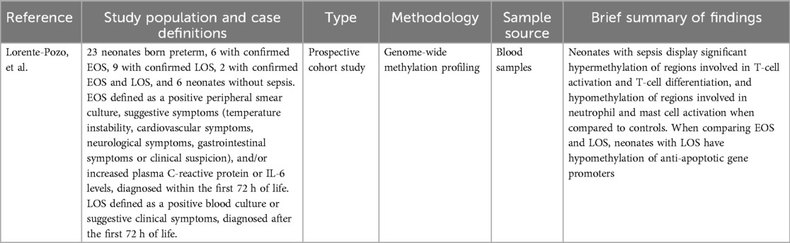 One study by Lorente-Pozo et al. (48) conducting epigenomic analysis was selected for review (Table 8). Neonates with sepsis show differential hypermethylation of the CD3G and CD3D gene promoters and hypomethylation of IL10 gene promoter compared to controls without sepsis. Greater changes in methylation were found when comparing neonates with LOS to controls than comparing neonates with EOS to controls. When comparing methylation in neonates with LOS to neonates with EOS, 4 significantly hypomethylated gene promoters were noted- DUSP22, PM20D1, MIR10A, and MIR886. Pathway analysis revealed significant hypermethylation of regions involved in T-cell activation and T-cell differentiation, and hypomethylation of regions involved in neutrophil and mast cell activation when comparing neonates with sepsis to controls.