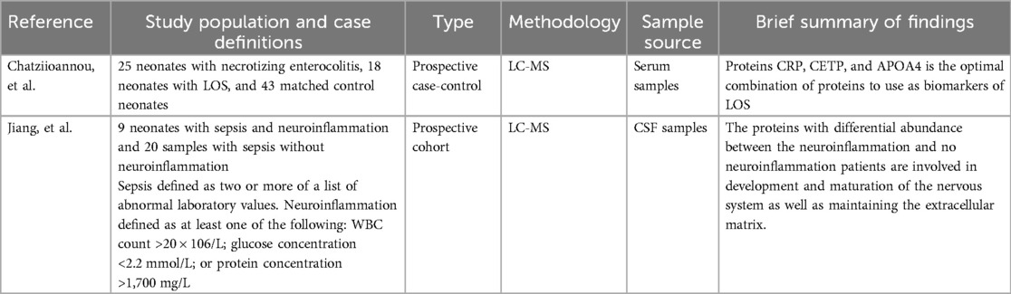 Two studies utilizing liquid chromatography–mass spectrometry (LC-MS) were selected for this review, each investigating different biological fluids to better understand protein expression in neonatal sepsis (Table 9). Chatziioannou et al. (49) conducted a prospective matched case-control study to evaluate the serum proteomic profile of neonates with LOS. Analysis of serum samples identified a panel of three proteins that showed potential as diagnostic biomarkers: apolipoprotein A-IV (APOA4), cholesteryl ester transfer protein (CETP), and C-reactive protein (CRP) (49). In contrast, Jiang et al. (50) explored cerebrospinal fluid (CSF) proteomic changes in a cohort of neonates with sepsis who also exhibited signs of neuroinflammation. Analysis of CSF samples revealed a consistent decrease in proteins essential for neuronal circuit formation and extracellular matrix (ECM) stability (50). Among these were matrix metalloproteinase-2 (MMP-2), an enzyme that degrades components of the ECM, and cystatin C, a protease inhibitor known to play a protective role in the central nervous system. Other proteins such as brevican, nidogen-1 and −2, and fibronectin, all important structural elements of the ECM, were also found to be reduced in neonates with neuroinflammatory responses (50).