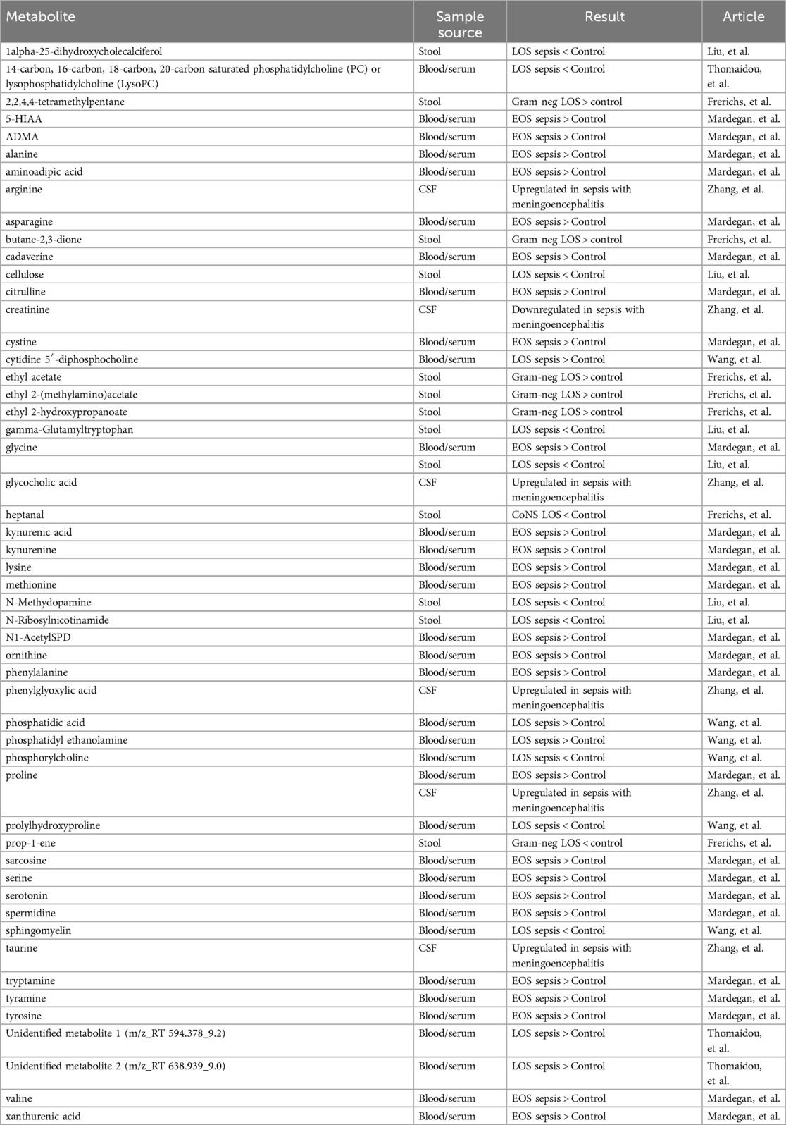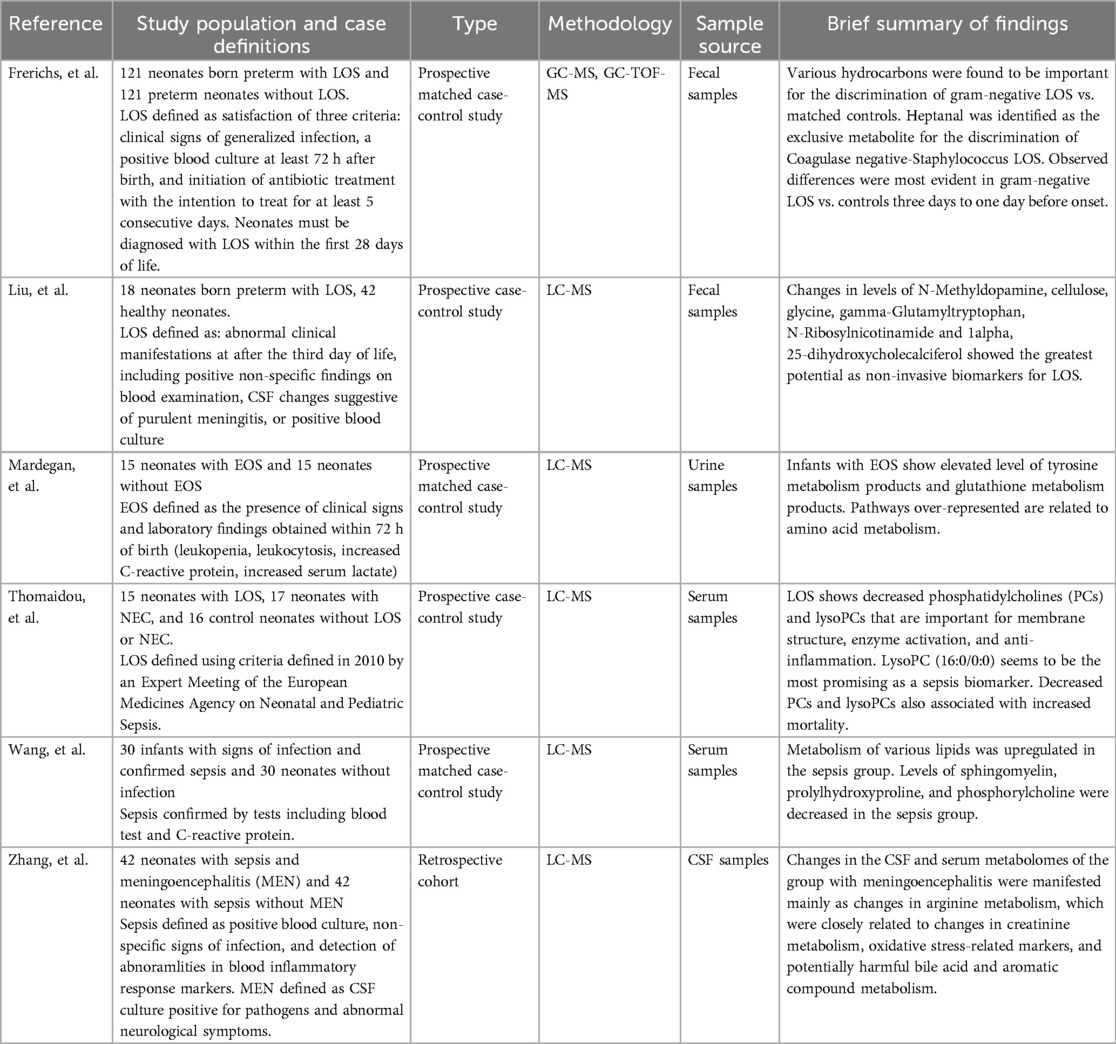 Six studies were selected that employed mass spectrometry-based metabolomic profiling to investigate neonatal sepsis (Table 10). All but one (51) utilized LC-MS as the primary analytical method, with a single study relying on gas chromatography coupled with time-of-flight mass spectrometry (GC-TOF-MS). These studies highlighted distinct alterations in the metabolic landscape of neonates with sepsis, revealing potential biomarkers and underlying pathways involved in disease progression.