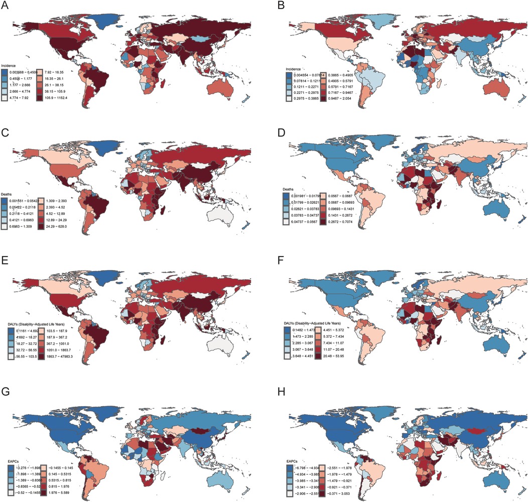 Figure 1. National burden of Hodgkin lymphoma (HL) in people aged < 20 years in 2021. (A) Incidence number. (B) Age-standardized incidence rates (ASIR). (C) Mortality number. (D) Age-standardized mortality rates (ASMR). (E) Disability-adjusted life years (DALYs) number. (F) Age-standardized DALYs rates (ASDR). (G) Estimated annual percentage change (EAPC) number. (H) Estimated annual percentage change (EAPC) rate. The source code of ggmap is available at: https://github.com/dkahle/ggmap