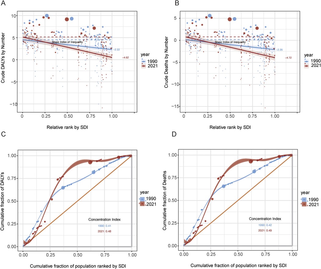Figure 2. Inequality analysis of DALYs and deaths by SDI, 1990–2021. (A) Slope Index of Inequality (SII) for crude DALYs across SDI-ranked populations in 1990 and 2021. (B) SII for crude deaths using the same SDI ranking. (C) Concentration curves and concentration indices for DALYs by SDI rank in both years. (D) Concentration curves and concentration indices for deaths by SDI rank in both years.
