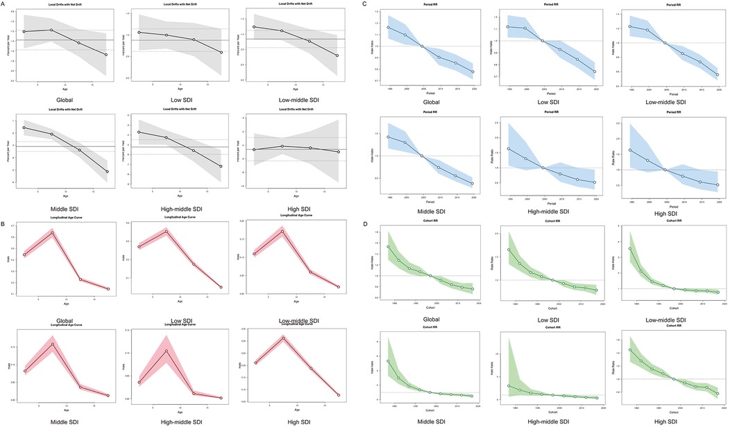 The age-period-cohort analysis identified a consistent peak in age-specific risk around the 5–9 years group across all SDI regions. The favorable period and cohort effects globally likely stem from secular improvements in nutrition, sanitation, and management of immunocompromising conditions like HIV, which have collectively reduced population-level risk. The global decline in HL burden is consistent with improved control of known risk factors, such as the expansion of antiretroviral therapy leading to improved immune function in people living with HIV. These observations suggest that continued public health gains in these areas are crucial for sustained progress.