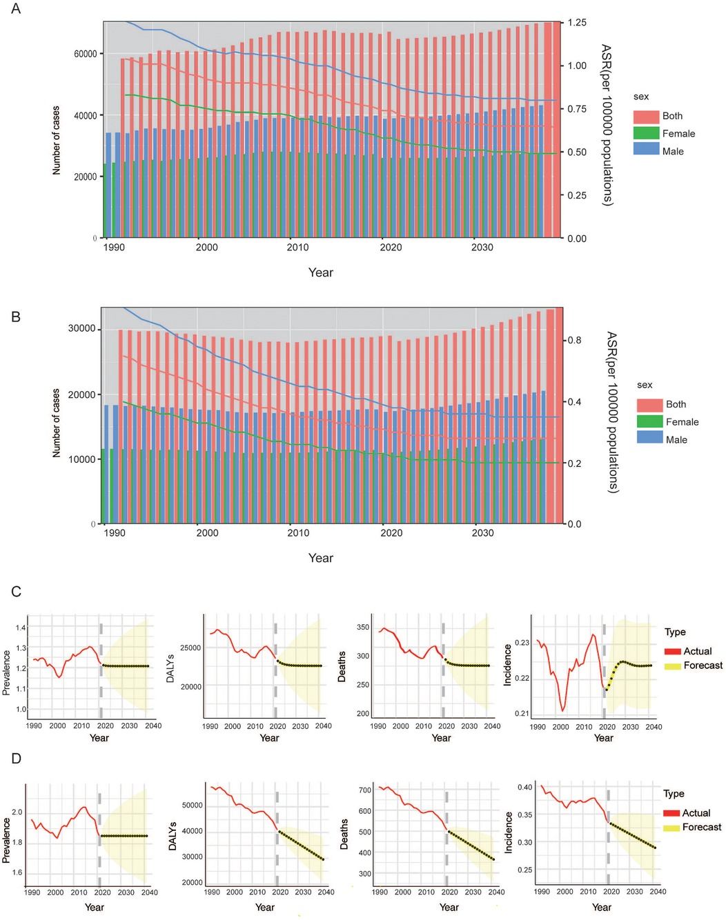 Figure 4. Projects the ASIR (A), ASMR (B) and numbers of HL in all population for global from 2022 to 2040. Projects the ASIR, ASPR, deaths and DALYs number of HL in female (C) and male (D) children and adolescents for global from 2022 to 2040. ASIR, age-standardized incidence rate; ASMR, age-standardized mortality rate; ASPR, age-standardized prevalence rate; DALYs, disability adjusted life years.