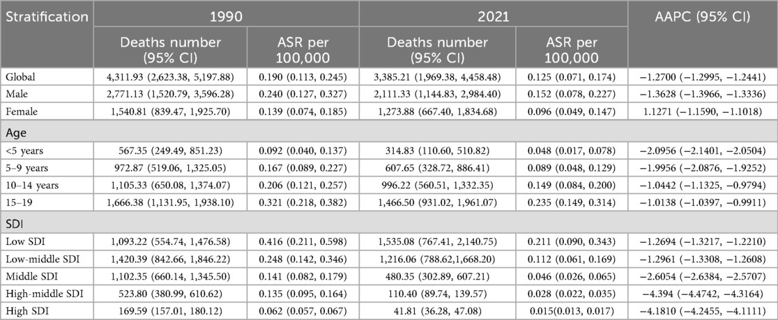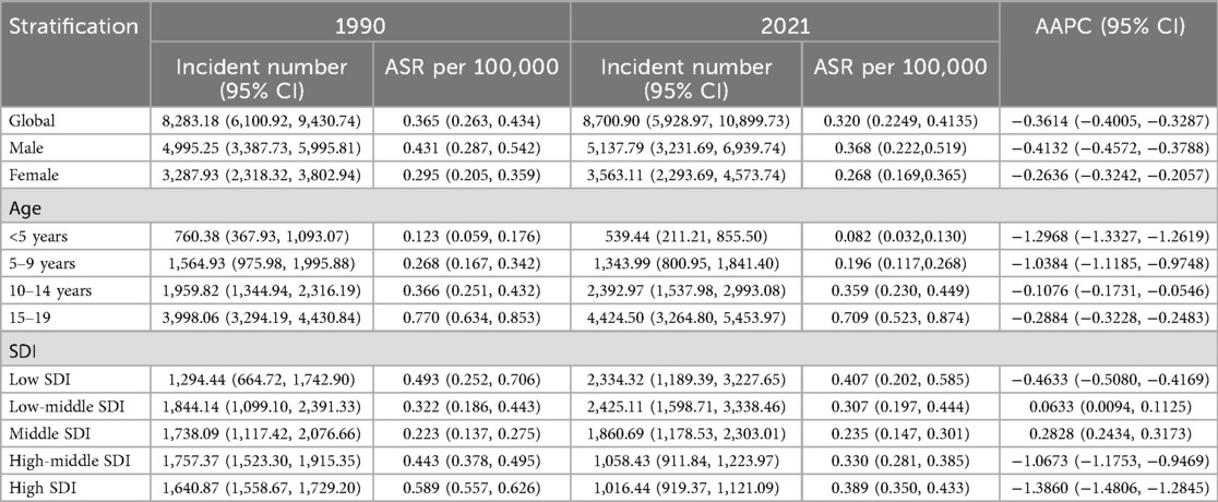 As Table 1 showed, HL epidemiology among children and adolescents exhibits diverging temporal signatures between crude caseloads and standardized rates. Global HL cases among children and adolescents increased 5.04% (8,283 in 1990; 8,700 in 2021), while ASIR declined from 0.365/100,000 in 1990 to 0.320/100,000 in 2021, with the AAPC of −0.36%, underscoring demographic expansion's role in offsetting rate reductions. However, a significant decline was observed globally in the number of deaths, ASMR, DALYs and ASDR of HL among children and adolescents from 1990 to 2021. In 2021, Compared with those in 1990, the number of deaths and ASMR decreased by 21.5% (3,385 vs. 4,312) and 34.2% (0.190 vs. 0.125 per 100,000) in 2021, respectively. The DALYs and ASDR declined by 22.1% (339,995 vs. 265,016) and 34.7% (15.028 vs. 9.816 per 10,0000), respectively.