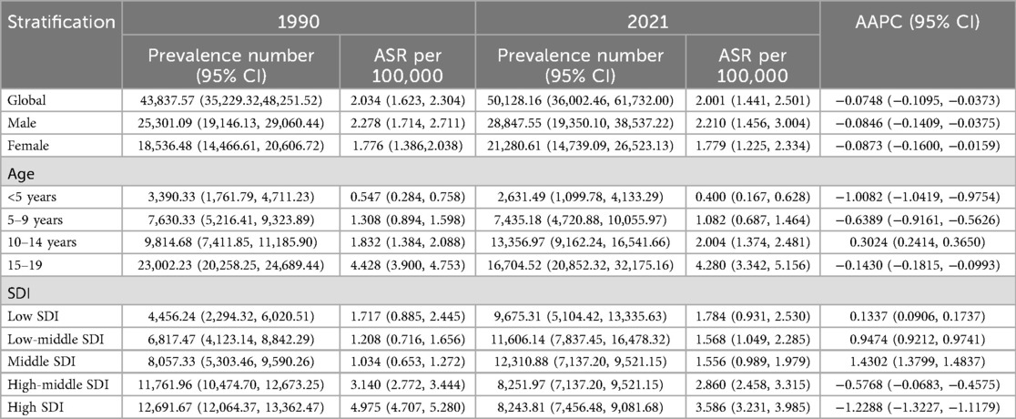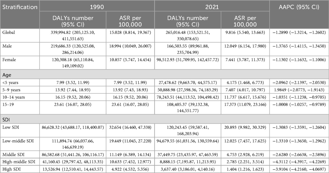 All data cloud was accessible for free access through the GBD 2021 (https://ghdx.healthdata.org/gbd-2021/sources). This disability-weighted metric system quantifies health loss through triangulated incidence-prevalence-mortality modeling (10). All epidemiological datasets and computational codes are accessible via the Global Health Data Exchange (GHDx) repository, with comprehensive metadata documenting case definitions, modeling algorithms, and uncertainty analyses across GBD iterations (11). Sociodemographic Index (SDI) quintile stratification synthesizing per capita income, educational attainment, and fertility rates was employed to compare disease trajectories across development continua: low, low-middle, middle, middle-high, and high SDI cohorts (12).