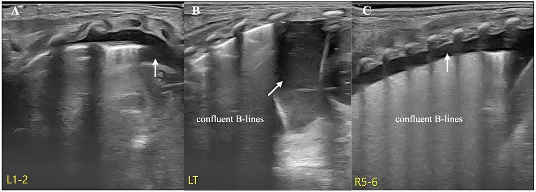 A female infant with a gestational age of 31 weeks and 2 days was delivered via emergency cesarean section owing to unknown causes of fetal heart rate reduction. She was admitted to the NICU because of premature birth and mild respiratory difficulties shortly after birth. LUS examination on admission revealed anechoic areas in the bilateral thoracic cavities and a significant number of confluent B-lines in both lungs but no lung consolidation with air bronchograms. Therefore, the patient was initially diagnosed with congenital pleural effusion and transient tachypnea of the newborn (TTN) according to the LUS findings, and noninvasive respiratory support was administered to the infant (Figure 1) (informed consent to publish the images and videos was obtained from the parents).