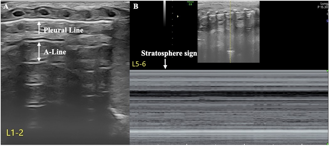 Figure 2. Severe pneumothorax in the left thoracic cavity. LUS revealed clear pleural lines and A-lines in the anterior chest, axilla, and posterior chest of the left lung on B-mode ultrasound. M-mode ultrasound revealed the stratosphere sign, and real-time ultrasound revealed disappearance of lung sliding (Supplementary Video S1), suggesting a large amount of pneumothorax in the left thoracic cavity (A: B-mode ultrasound, B: M-mode ultrasound).