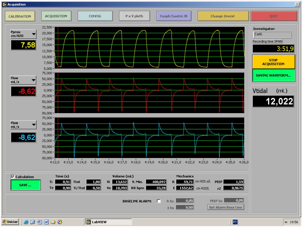 Throughout the ventilation sessions (V1–V5), the manikin was connected to a computerized data acquisition system that recorded the ventilatory pressure via a pressure sensor (Validyne, model DP45-24) and the inspiratory and expiratory flow via a pneumotachograph (Hans Rudolph Inc., Kansas City, USA). After each dataset collection session, devices were calibrated using an external syringe to ensure the integrity of the manikin's lungs and to verify the proper function of the pressure and flow sensors. These sensors were connected to a continuous data acquisition system (LabVIEW 5.1, National Instruments), which was specifically developed for this study by R. A. Eletro Sistemas LTDA (Campinas, Brazil).