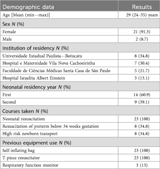 Before the first ventilation session, participants completed a questionnaire detailing their personal and demographic information (Table 1). Then, they were presented with a standardized neonatal resuscitation scenario involving a full-term neonatal manikin simulating an apneic newborn with an estimated weight of 2.5 kg and no esophageal replica, experiencing apnea, with bradycardia (<100 bpm), and requiring positive pressure ventilation (PPV) as per the national neonatal resuscitation guidelines—Brazilian Society of Pediatrics Guidelines on Neonatal Resuscitation (2022 update) (1).