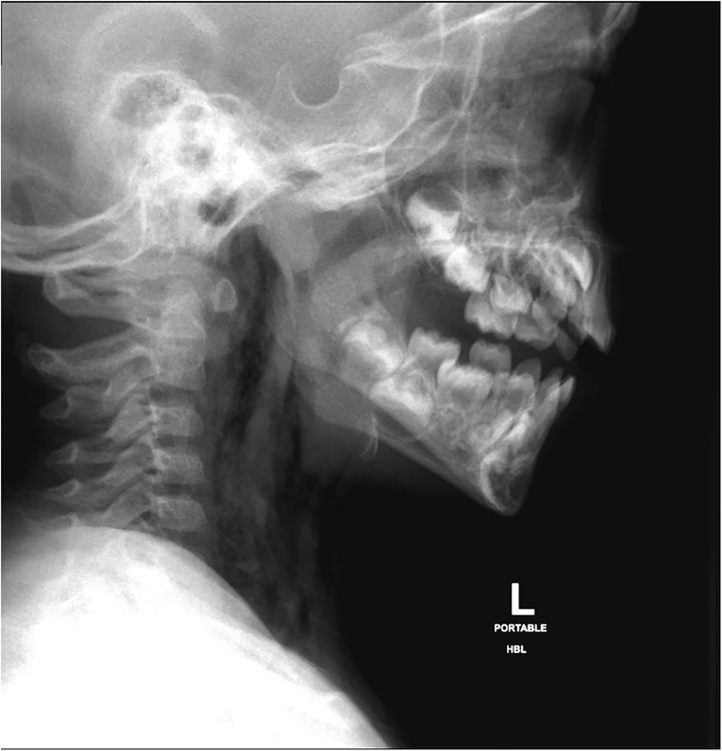 X-ray of a human neck and skull in a lateral view, showing the cervical vertebrae, jaw, and teeth. The image is labeled with the letter \