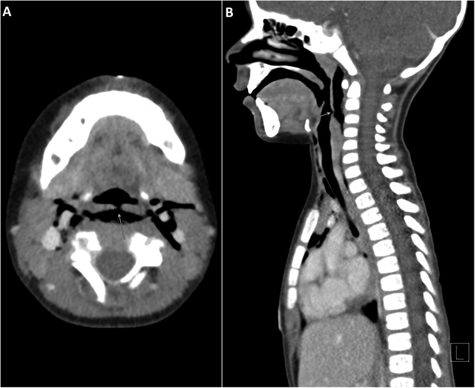 Figure 2. (A) Axial CT neck with IV contrast. A focal defect in the posterior hypopharyngeal wall (arrow). Soft tissue emphysema involves the retropharyngeal and prevertebral space and extends laterally surrounding the internal carotid arteries bilaterally. (B) Sagittal CT neck with IV contrast. Posterior hypopharyngeal wall defect (arrow) with extensive soft tissue emphysema tracking through the retropharyngeal and prevertebral spaces. CT, computed tomography.