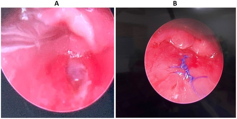 Two endoscopic images labeled A and B. Image A shows a reddish tissue structure. Image B displays a similar reddish tissue, highlighted with blue markings, possibly indicating a surgical intervention or diagnostic process.