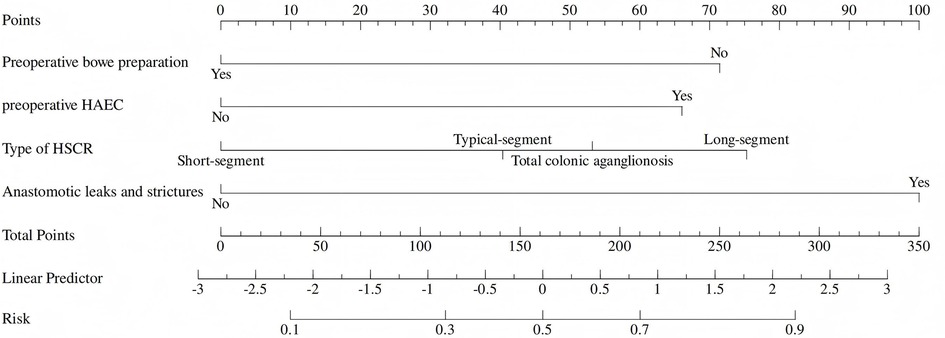 Although all patients diagnosed with HSCR are theoretically at risk of developing HAEC, a variety of factors have been identified that contribute to an elevated risk of this complication. These include family history of HSCR, trisomy-21, long-segment aganglionosis, delayed diagnosis, anastomotic leaks or strictures and prior episodes of HAEC (4–12). In addition, intestinal dysbiosis, macrophage infiltration, and neuroimmune abnormalities collectively promote the occurrence of HAEC (5, 13–15). Despite the identification of multiplerisk factors for HAEC, a predictive model for postoperative HAEC has not yet been established. Accordingly, we developed the first nomogram to predict the incidence of HAEC.