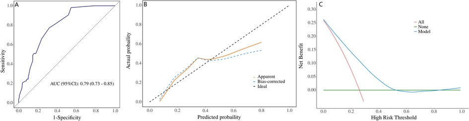 Figure 2. Validation of the nomogram. [(A) ROC curve for the nomogram, AUC = 0.79 (95% CI: 0.73–0.85). (B) Nomogram calibration curve. (C) DCA curve of nomogram. ROC, receiver operating characteristic; AUC, area under the receiver operating characteristic curve; DCA, decision curve analysis].