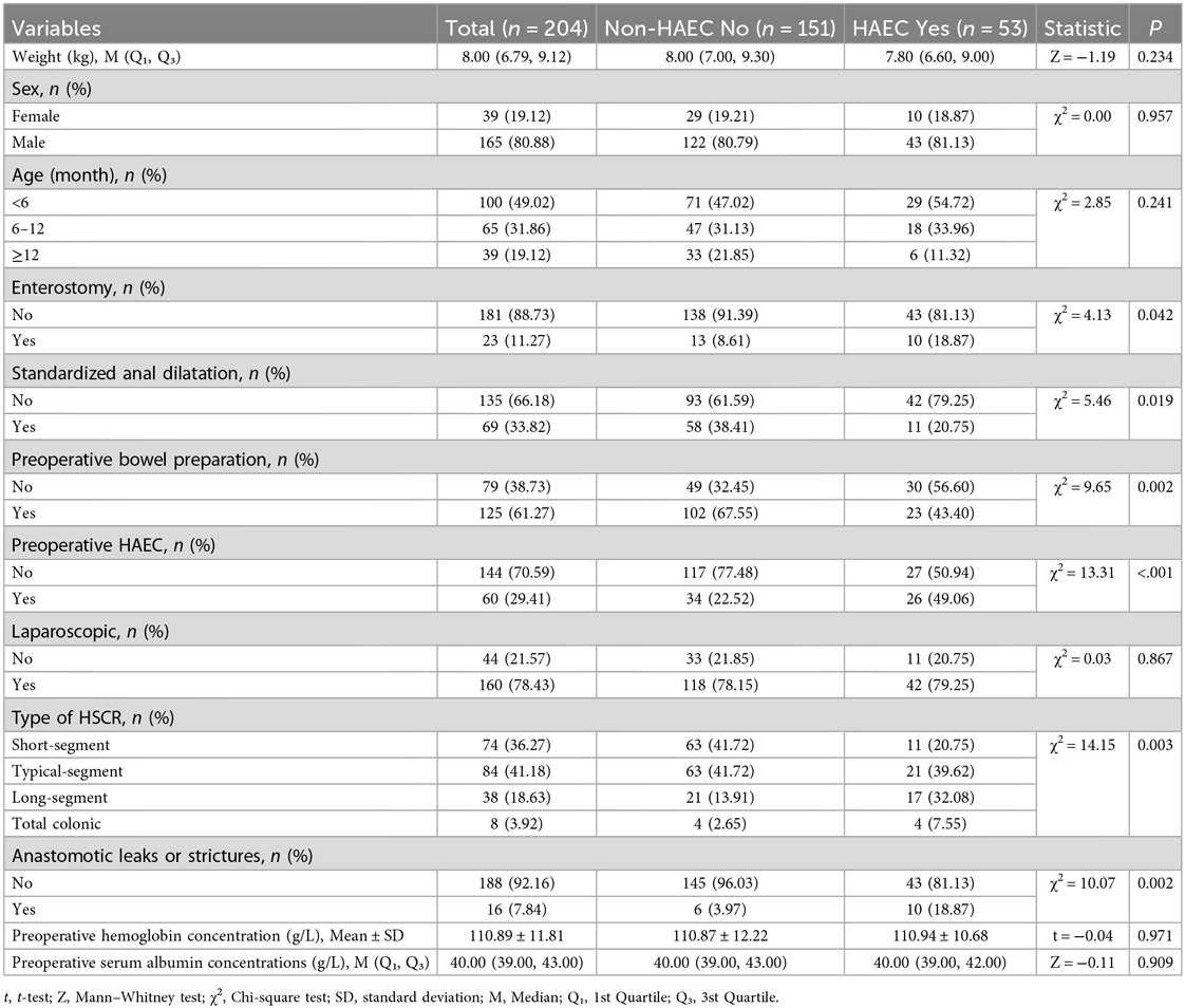 A total of 204 (165 males and 39 females) patients with HSCR, among whom 53 (43 males and 10 females) with HAEC (HAEC group) and 151 (122 males and 29 females) did not with HAEC (non-HAEC group). After univariate logistic regression analysis of the clinical data of the two groups, we found patients who underwent preoperative bowel preparation [HAEC (43.34%) vs. non-HAEC (67.55%), P = 0.002] or standardized anal dilatation [HAEC (20.75%) vs. non-HAEC (38.41%), P = 0.019] were significantly fewer in the postoperative HAEC group compared with the non-HAEC group. The HAEC group had a higher frequency of enterostomy [HAEC (18.87%) vs. non-HAEC (8.61%), P = 0.042] and preoperative HAEC [HAEC (49.06%) vs. non-HAEC (22.52%), P < 0.01]. In the HAEC group, the long-segment and the total colonic aganglionosis were significantly more than the non-HAEC group. Patients with postoperative anastomotic leaks or strictures [HAEC (18.87%) vs. non-HAEC (3.97%), P = 0.002] had a higher incidence of HAEC (Table 1).
