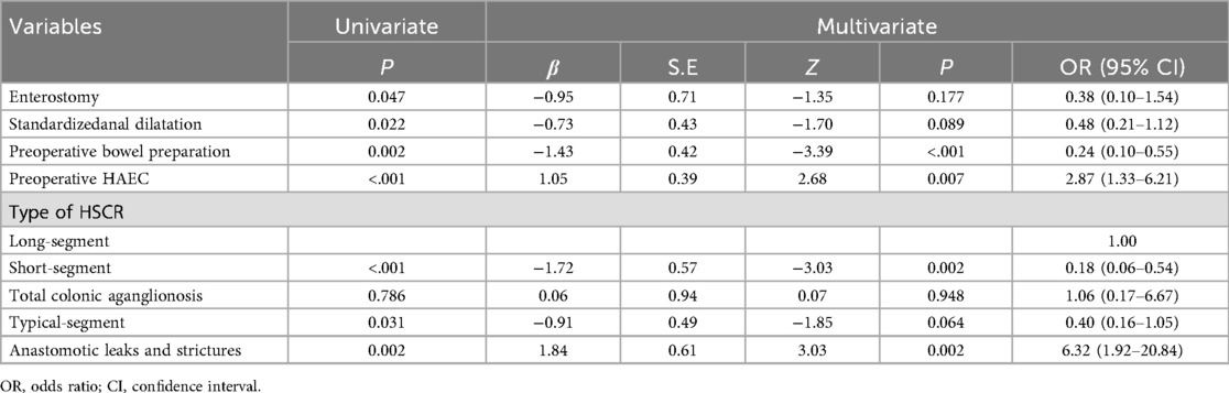We incorporated all predictors with statistical significance in univariate logistic regression analysis into the multivariate logistic regression analysis. Among them, preoperative HAEC, long-segment or total colonic aganglionosis, and anastomotic leaks or strictures are independent predictive factors influencing postoperative HAEC (P < 0.05). Preoperative bowel preparation is a protective factor for postoperative HAEC (P < 0.05) (Table 2).
