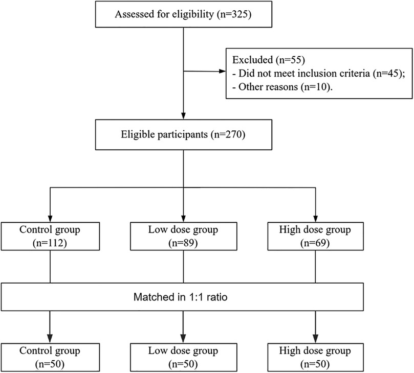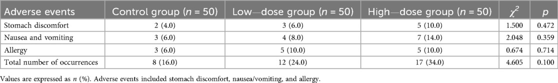 In the control group (n = 50), there were 2 cases of stomach discomfort, 3 cases of nausea/vomiting, and 3 cases of allergy, totaling 8 events (16%). In the low-dose group (n = 50), there were 3 cases of stomach discomfort, 4 cases of nausea/vomiting, and 5 cases of allergy, totaling 11 events (22%). In the high-dose group (n = 50), there were 5 cases of stomach discomfort, 7 cases of nausea/vomiting, and 5 cases of allergy, totaling 17 events (34%). Importantly, all adverse events were mild to moderate in severity, resolved with symptomatic management, and no serious adverse events were observed. There were no statistically significant differences in the incidence of each individual adverse event or the total number of events among the three groups (p > 0.05) (Table 5).