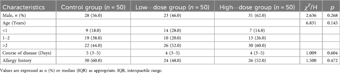 A total of 150 enrolled children were matched into three groups at a 1:1:1 ratio (Figure 1). There were no statistically significant differences in baseline characteristics such as gender, age, disease duration, or allergy history among the three groups (all p > 0.05) (Table 1).