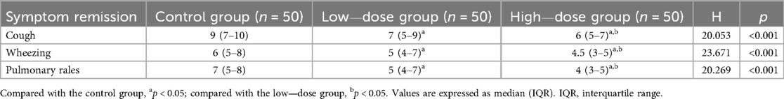 After treatment, the remission times of cough, wheezing, and pulmonary rales in the high—dose group were significantly shorter than those in the low—dose group and the control group, and the remission time in the low—dose group was significantly shorter than that in the control group (all p < 0.05) (Table 2).