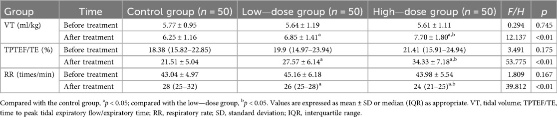 Before treatment, there were no significant differences in the levels of VT, TPTEF/TE, and RR among the three groups of children (all p > 0.05). After treatment, the VT and TPTEF/TE in the high—dose group were significantly higher than those in the other two groups, and the low—dose group had higher levels than the control group; while the RR in the high—dose group was significantly lower than that in the two groups, and the low—dose group had a lower RR than the control group (all p < 0.05) (Table 3).