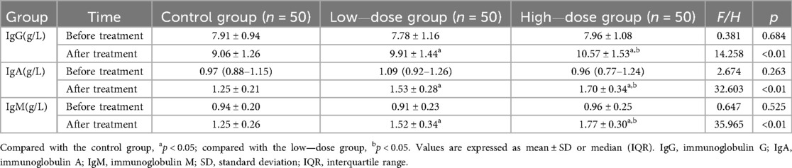 Before treatment, there were no significant differences in the levels of IgG, IgA, and IgM among the three groups of children (all p > 0.05). After treatment, the levels of IgG, IgA, and IgM in the high—dose group were significantly higher than those in the other two groups, and the levels in the low—dose group were significantly higher than those in the control group (all p < 0.05) (Table 4).