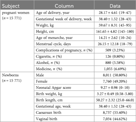 The baseline characteristics of pregnant women in the study cohort are summarized in Table 1 top. Demographic and clinical parameters, including age at delivery (28.17 ± 4.61, 19–47 years), gestational week at delivery (38.40 ± 1.52, 28–43 weeks), weight (59.67 ± 8.31,45–95 kg), height (161.65 ± 4.82, 145–180 cm), age of menarche (14.21 ± 2.62, 10–24 years), menstrual cycle (26.15 ± 12.18, 18–79 days), complications of pregnancy (509, 3.23%), and lifestyle factors such as cigarette use (126 (126, 0.80%), alcohol consumption (1,055, 6.69%). The baseline characteristics of newborns in the study cohort are presented in Table 1 bottom. Clinical parameters included neonatal Apgar score (9.27 ± 0.98, 0–10), birth weight, (3.27 ± 0.49, 0.58–5.80 kg), birth length, (50.27 ± 2.32, 25.0–66.0 cm), gestational age (38.40 ± 1.52, 28–43week), and so on.