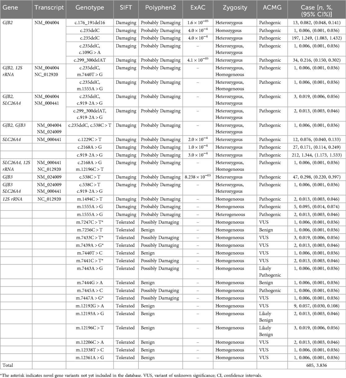 Neonatal screening for genetic variants associated with hearing loss represents a critical preventive strategy. Early identification facilitates timely interventions to mitigate speech development impairment secondary to deafness (preventing speech delay associated with deafness), reduces the incidence of delayed-onset hearing loss, provides essential medication guidance for at-risk individuals to prevent aminoglycoside-induced ototoxicity, and offers crucial information for future family planning (13). In our cohort of 15,771 newborns, we identified 605 carriers of pathogenic variants across four major deafness-associated genes, yielding a carrier rate of 3.836%. The primary genes investigated included GJB2, SLC26A4, GJB3, and 12S rRNA, which are known to be significant contributors to genetic deafness in the Chinese population. In the Chinese population, the carrier rates of common hereditary hearing loss variants are as follows:GJB2 variants: c.235delC: ∼1.80%, c.299_300delAT: ∼0.50%, c.176del16: ∼0.12%, c.35delG: ∼0.01%, c.109G > A: ∼6.93%; SLC26A4 variants: c.919-2A > G: ∼1.34%, c.2168A > G: ∼0.27%, c.1229C > T: ∼0.08%; 12S rRNA variants: m.1555A > G: ∼0.21%, m.1494C > T: ∼0.02%, m.7445A > C: ∼0.02%, m.12201T > C: ∼0.01%; c.538C > T: ∼0.30% (14).