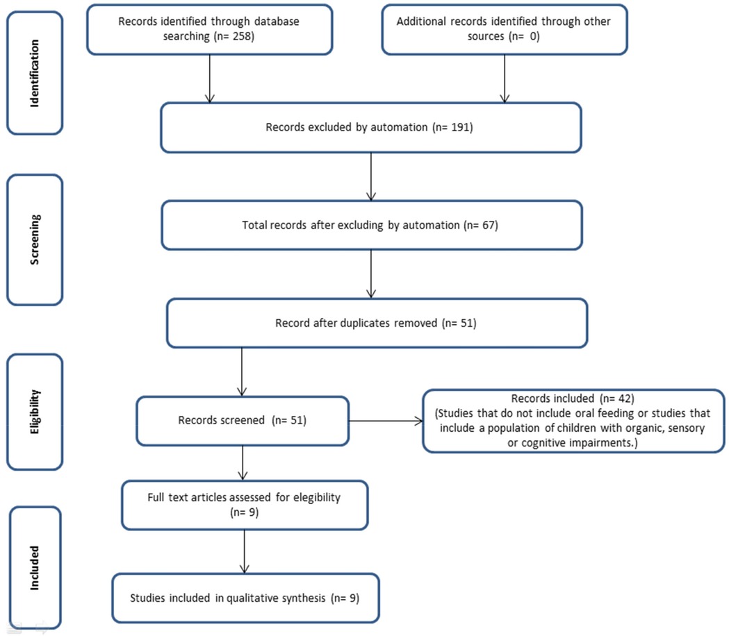 During the search and selection process, 258 records were identified through electronic database searches, with no additional sources retrieved. After removing irrelevant entries, 67 articles remained for evaluation. During screening, 191 records were excluded through automated processes, and 51 records were retained after duplicate removal. In the eligibility phase, all 51 records were reviewed, and 9 full-text articles met the inclusion criteria. Ultimately, 9 studies were incorporated into the qualitative synthesis, while 42 were excluded for not meeting the inclusion criteria, primarily due to the absence of oral feeding assessment or inclusion of children with specific disabilities (Figure 1). The articles were required to include a direct comparison between infants fed with breast milk and those fed with bottles or using pacifiers. This comparison should elucidate their impacts on oral–motor development, stomatognathic functions, or even craniofacial structures. The results could be described via statistical analyses using dependent and independent variables of oral motor behavior, information about the mother, data on the infant, and behavior during sucking. This would lead to the formulation of a quantitative or qualitative hypothesis in line with the objective of the study.