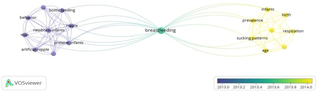 As depicted in Figure 2 generated via the VOSviewer v.1.6.18 tool, the co-occurrence of the most relevant terms identified in the selected articles from the Web of Science database was established. The nodes represented the keywords, and their size was related to their frequency. Thus, it was concluded that “breastfeeding” was a term that was related to the terms of age, sucking patterns, behavior, breathing, infants, birth, prevalence, bottle feeding, newborns, nipple, milk, artificial teat, and premature. Most of these terms were considered in the search formula constructed from the PECO strategy. It was also observed that the publications with the greatest impact for this research were included within the timeframe of 2013–2014.