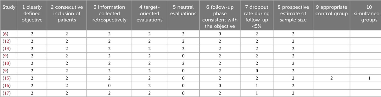 The methodological quality of the chosen articles identified using the search strategy was appraised using the MINORS bias scale. This scale comprises 12 predetermined principles or evaluated questions, with the last 4 questions applied solely to comparative studies. This scale allowed the development of an objective evaluation by means of a score of 0 - 1 - 2 determining the quality of the information presented in the articles, with 0 signifying not informed, 1 denoting informed but inadequately informed, and 2 indicating adequately informed. The scale establishes a score based on the total number of items evaluated, resulting in a maximum score of 24 points. Therefore, an acceptable score is considered when half of the total evaluation points are obtained.