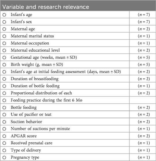 The most significant variables identified in the articles reviewed (Table 2) were related to the sociodemographic data of the population, including children and mothers, as well as prenatal, perinatal, and postnatal aspects. Likewise, variables related to the duration of bottle feeding and breastfeeding were identified, together with the percentage of each feeding practice. Finally, variables directly related to the sucking behavior and the infant's feedings per min ratio were considered. The distribution of the articles corresponding to each variable is shown in Table 2.