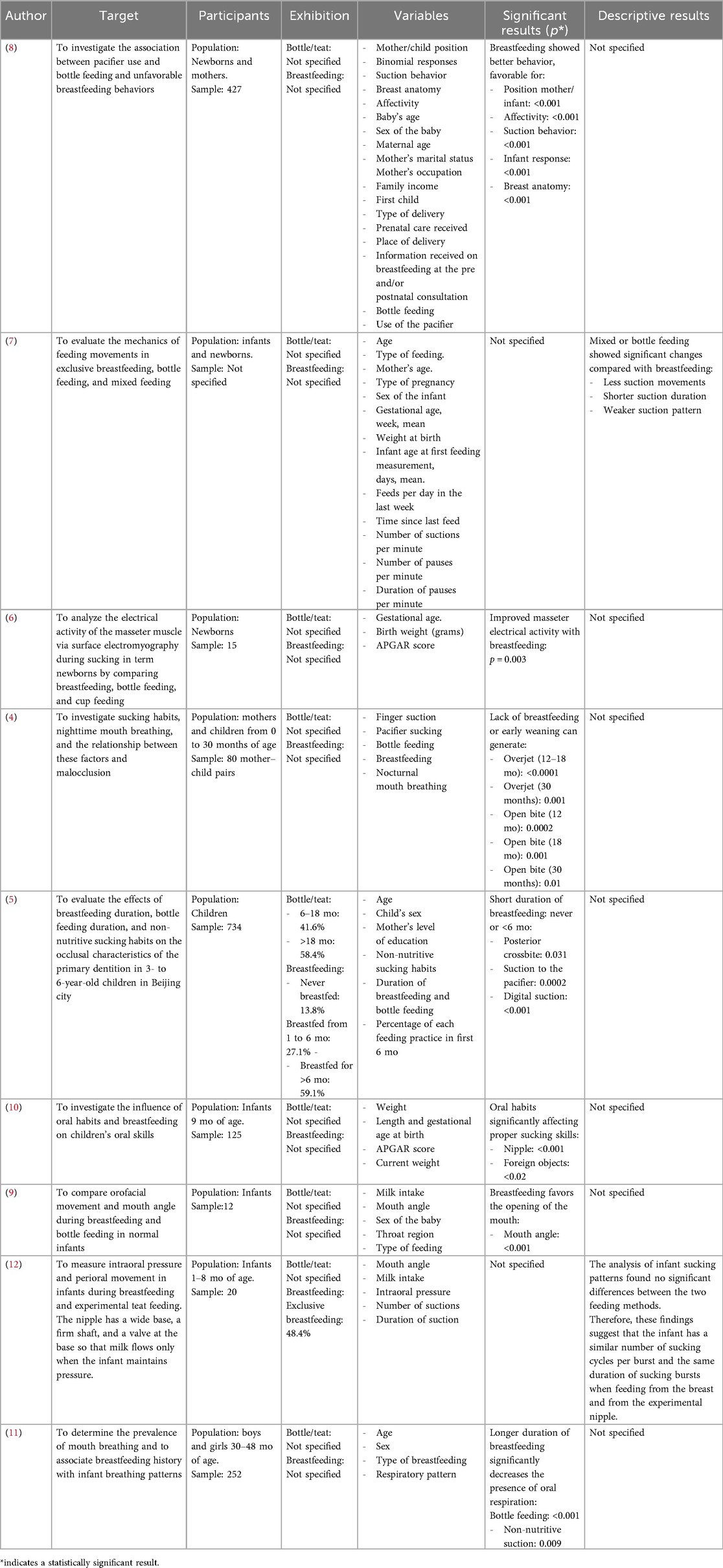 Upon analyzing the nine selected articles (Table 3), we observed a pattern demonstrating that prolonged bottle use leads to a series of consequences not only in relation to sucking pattern behavior but also in anatomical and functional alterations during orofacial development, specifically in the posture and muscle dynamics of the lips and tongue. A cross-sectional study involving 427 infants and addressing behaviors such as position, mother–child binomial affectivity, adequacy of sucking, baby's responses, and mother's anatomy showed poor performance in the bottle-fed group across all five behaviors analyzed (p < 0.001), with a particular emphasis on the sucking behavior (8).