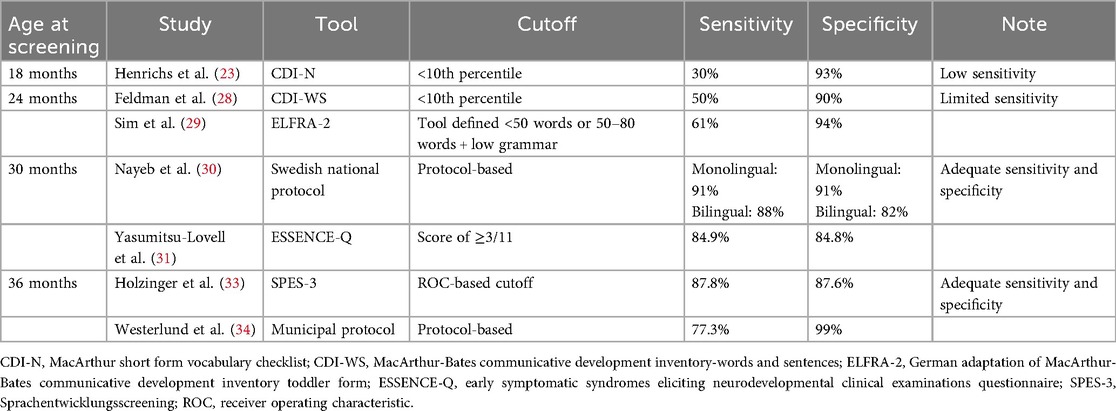 Overall, the evidence supports age 2.5 years as the point at which screening performance consistently demonstrates satisfactory levels of sensitivity and specificity. In particular, the Swedish policy shift and supporting data from both monolingual and bilingual populations underscore the effectiveness of screening at 2.5 years (30). Moreover, the use of multi-domain tools such as ESSENCE-Q at this age can further strengthen early identification by capturing comorbidities that commonly co-occur with DLD.