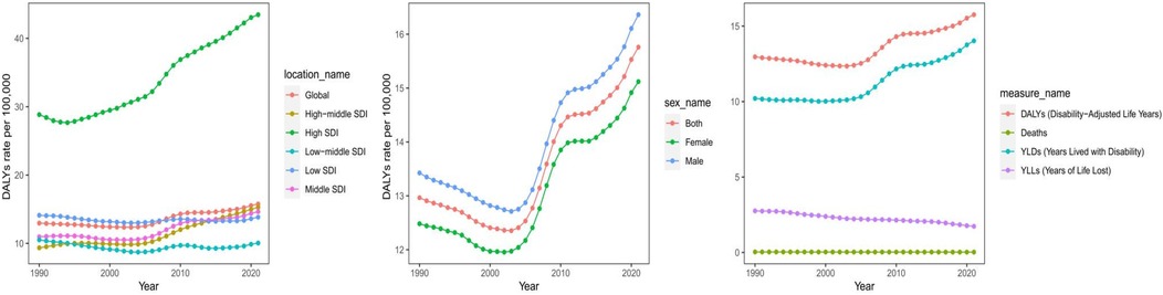 Three line graphs show DALYs rates per 100,000 from 1990 to 2020. The first graph compares global and SDI levels, with High SDI showing the highest rates. The second graph compares by sex, indicating males have slightly higher rates. The third graph shows trends for DALYs, deaths, YLDs, and YLLs, with YLDs increasing and deaths decreasing slightly over time.