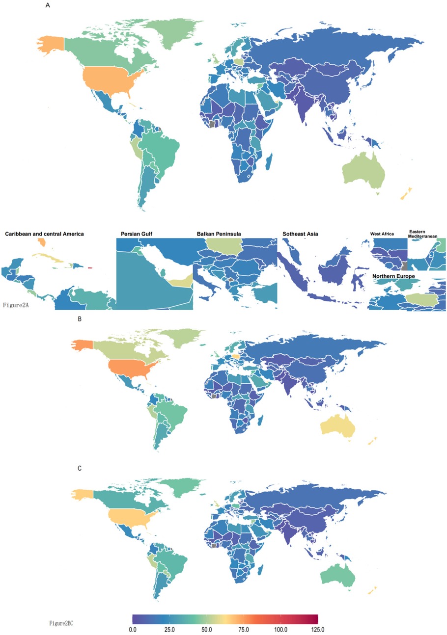 Three world maps highlighting various regions with color-coded data. Map A has zoomed in sections for Caribbean, Persian Gulf, Balkan Peninsula, Southeast Asia, West Africa, Northern Europe, and Eastern Mediterranean. All maps display countries in colors ranging from blue to orange according to a scale from zero to one hundred twenty-five, indicating data variability across regions.