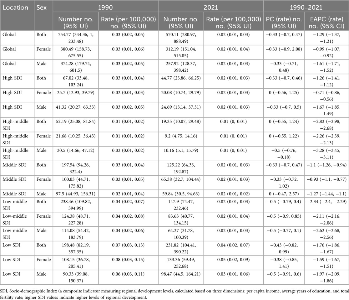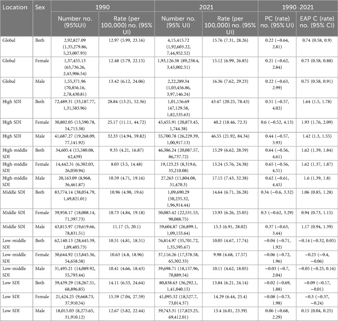 In terms of SDI regions, the crude death rate significantly decreased from 1990 to 2021 in high SDI regions (EAPC = −1.26, 95% CI: −1.41 to −1.12), while the crude DALY rate increased (EAPC = 1.64, 95% CI: 1.50–1.78). High-middle SDI regions had the most substantial reduction in crude death rates (EAPC = −2.83, 95% CI: −2.98 to −2.68), whereas the crude DALY rate increased (EAPC = 1.62, 95% CI: 1.39–1.84). Middle SDI regions had a moderate decline in crude death rates (EAPC = −1.10, 95% CI: −1.26 to −0.94) and an increase in crude DALY rates (EAPC = 1.06, 95% CI: 0.85–1.28). Low-middle and low SDI regions showed the slowest declines in crude death rates (EAPC = −2.34 and −1.76, respectively), with relatively minor changes in crude DALY rates (EAPC = −0.14 in low-middle SDI regions and −0.09 in low SDI regions) (Tables 1, 2, Figure 1).