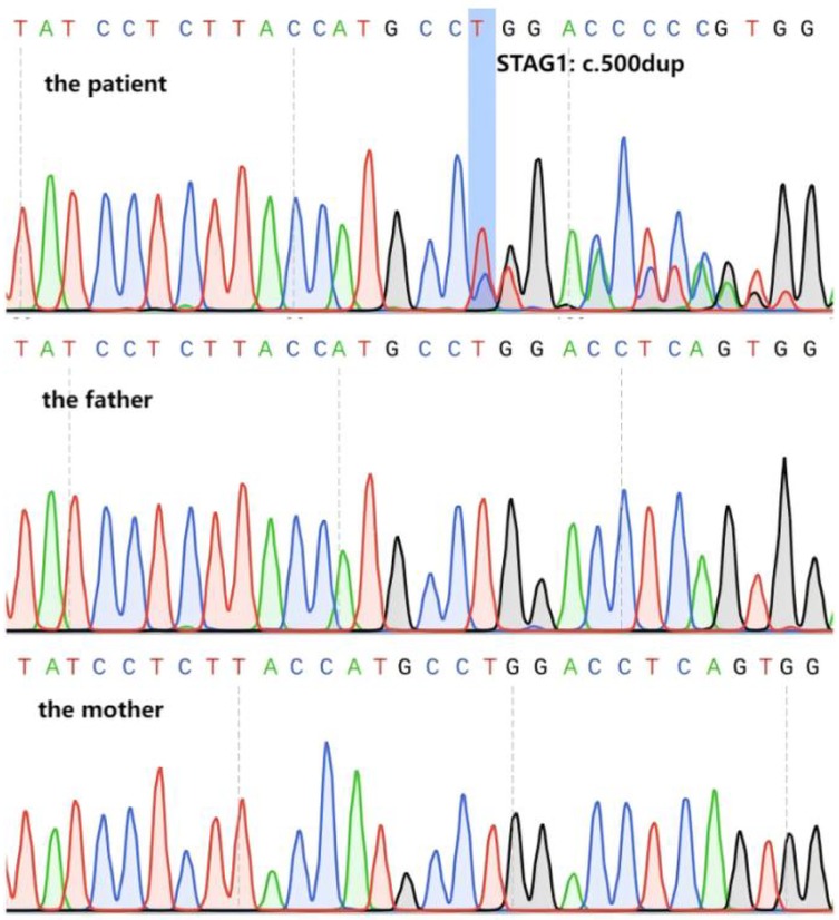 Figure 1. Variant verification of Sanger sequencing. Sanger sequencing confirmed that the patient carried the heterozygous frameshift variant in STAG1 gene (NM_005862.3) c.500dup (marked by the blue box), the parents were normal.