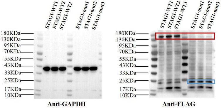 Figure 3. Western blot analysis of STAG1 protein. The results of WB analysis showed that mutant STAG1 cell lines could not produce the normal STAG1 protein compared to the STAG1-WT cell lines (marked by the red box). The molecular mass of normal STAG1 (NM_005862.3) was about 144 kDa. The theoretical molecular mass of the truncated STAG1 protein was approximately 22.9 kDa (marked by the blue box). Each cell line underwent three independent replicates of WB analysis.