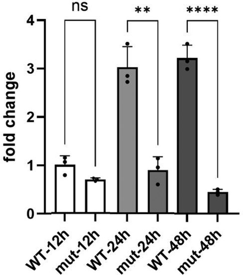 Figure 4. The relative STAG1 protein expression. The relative STAG1 protein expression was quantified by the fold change (FC). WB analysis indicated that the relative expression level of STAG1 protein in the STAG1-mut group was significantly lower than that in the STAG1-WT group. From 12 to 24 h, FC showed a slow upward trend (increasing from 0.69 to 0.90), while from 24 to 48 h, it exhibited a more significant downward trend (decreasing from 0.90 to 0.45). Each cell line underwent three independent replicates of WB analysis. The difference between STAG1-WT and STAG1-mut was evaluated by Student's t-test. **P < 0.01, ***P < 0.001, ns: not significant.